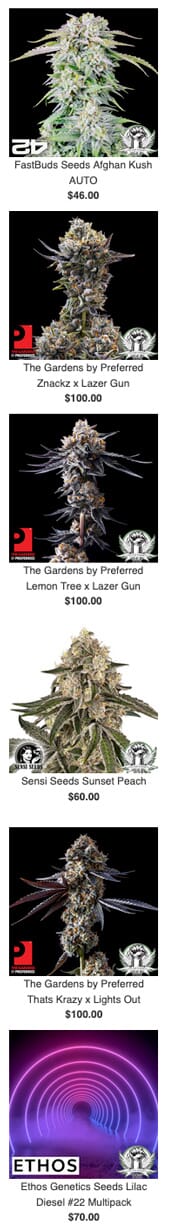 • 00 Seeds • A • Advanced Seeds • Anesia Seeds • Archive Seeds • B • Barney's Farm Seeds Promo • Bayou Boys Genetics Seeds Promo • Beyond Hype Seed Co Seeds Promo • Blimburn Seeds Promo • Blue Star Seed Co • Brothers Grimm Seeds Promo • BSF Seeds • Buds and Roses Seeds • Bulk Seeds • C • Cali Connection Seeds • Capulator Seeds • Cipher Genetics Seeds Promo • Compound Genetics Seeds • Conscious Genetics Seeds Promo • Cookies Seeds • Crockett Family Farms Seeds Promo • D • Deep Space Creations Seeds • Divine Fatale Genetics Seeds • DJ Short Seeds • DNA Genetics Seeds Promo • Dutch Passion Seeds • Dynasty Genetics Seeds • E • Elev8 Seeds Promo • Emerald Triangle Seeds • Ethos Genetics Seeds Promo • Exotic Genetix Seeds • F • FastBuds Seeds Promo • Freak Genetics Seeds • Frost World Genetics Seeds • G • G13 Labs Seeds • GG Genetics Seeds • Golden State Banana Seeds • GrandDaddy Genetics Seeds • Grandiflora Genetics Seeds Promo • Grateful Seeds • Green Bodhi Seeds • Green House Seeds Promo • Grounded Genetics Seeds • H • Happy Dreams Genetics Seeds Promo • Holy Smoke Seeds Promo • House of the Great Gardener Seeds • Humboldt CSI Seeds Promo • Humboldt Seed Organization Seeds • I • In House Genetics Seeds • Irie Genetics Seeds Promo • K • Karma Genetics Seeds Promo • L • La Chanvriere Seeds • LIT Farms Seeds Promo • Little Chief Collabs Seeds • M • Mass Medical Strains Seeds Promo • Mephisto Genetics Seeds • Mosca Seeds Promo • O • Offensive Selections Seeds • OG Raskal Seeds • Original Dampkring Genetics Seeds • P • Paradise Seeds • Perfect Tree Seeds Promo • Pheno Finder Seeds • Pure Instinto Seeds Promo • R • Rare Dankness Seeds • Relentless Genetics Seeds Promo • Relic Seeds • R-Kiem Seeds Promo • Royal Queen Seeds • S • Savage Genetics Seeds • Second Generation Genetics Seeds • SeedStockers Seeds • Sensi Seeds Promo • Serious Seeds • SinCity Seeds Promo • Soma Seeds • StarFire Genetix Seeds • Sweet Seeds Promo • T • TGA Mz Jill Genetics Seeds Promo • TH Seeds Promo • The Original Big Buddha Family Farms Seeds • The Plug Seedbank Seeds • True Canna Genetics Seeds Promo • U • Ultra Genetics Seeds • W • Wizard Trees Genetics